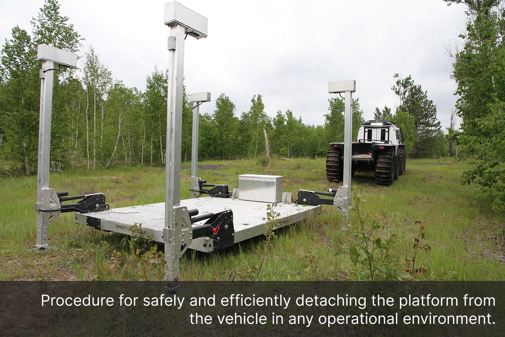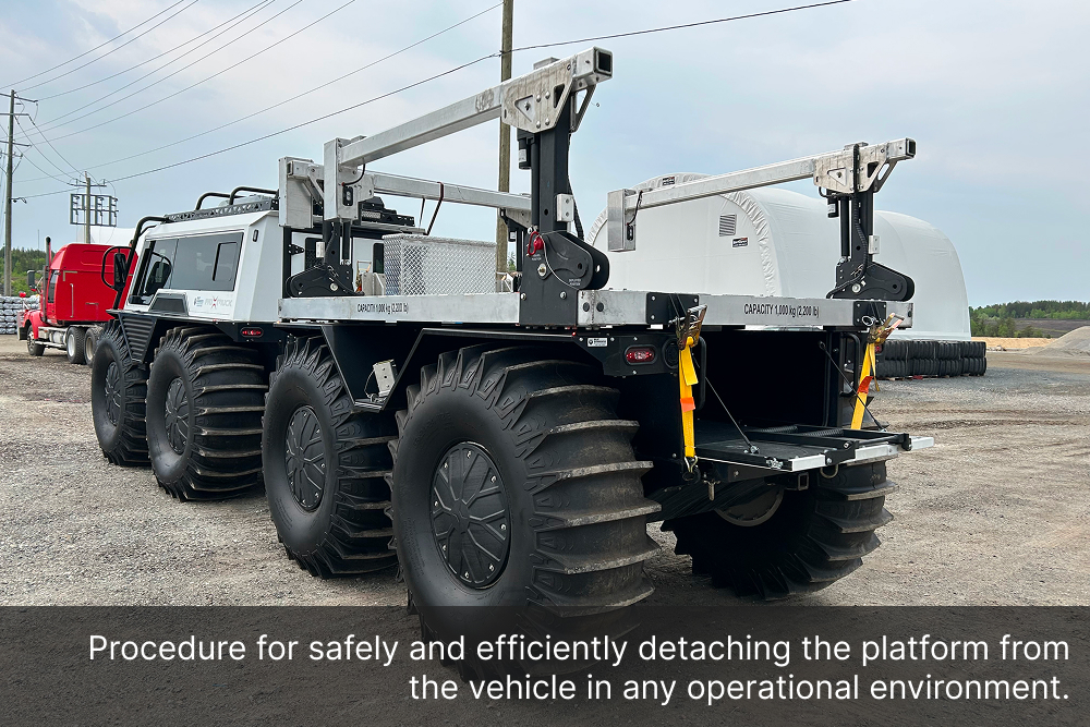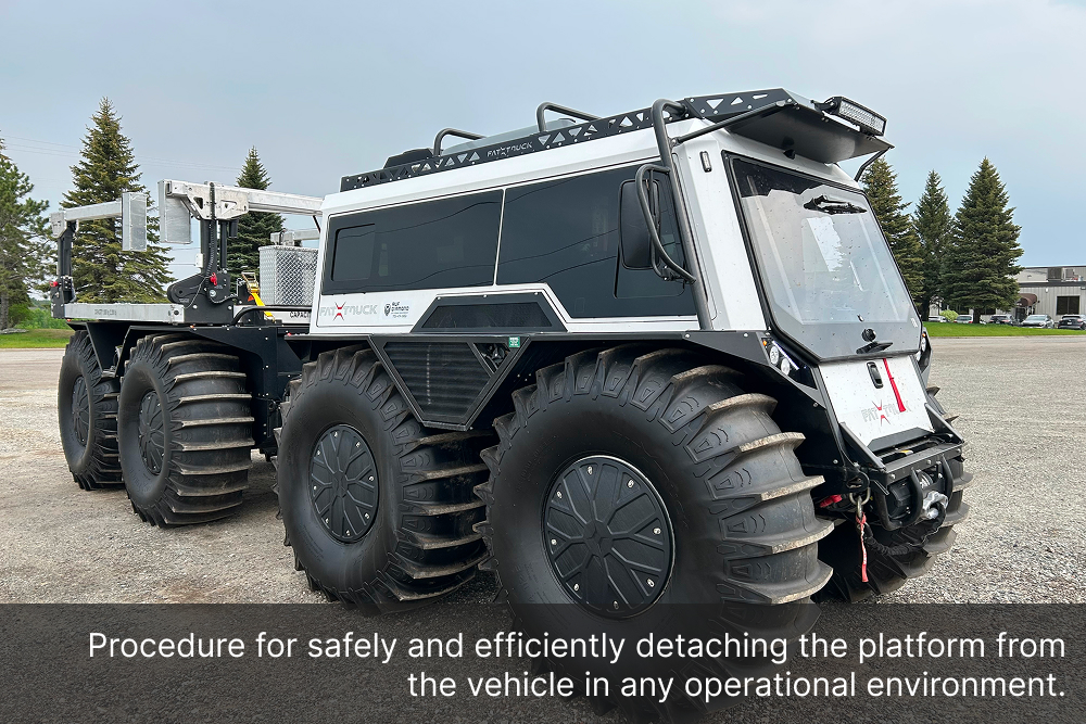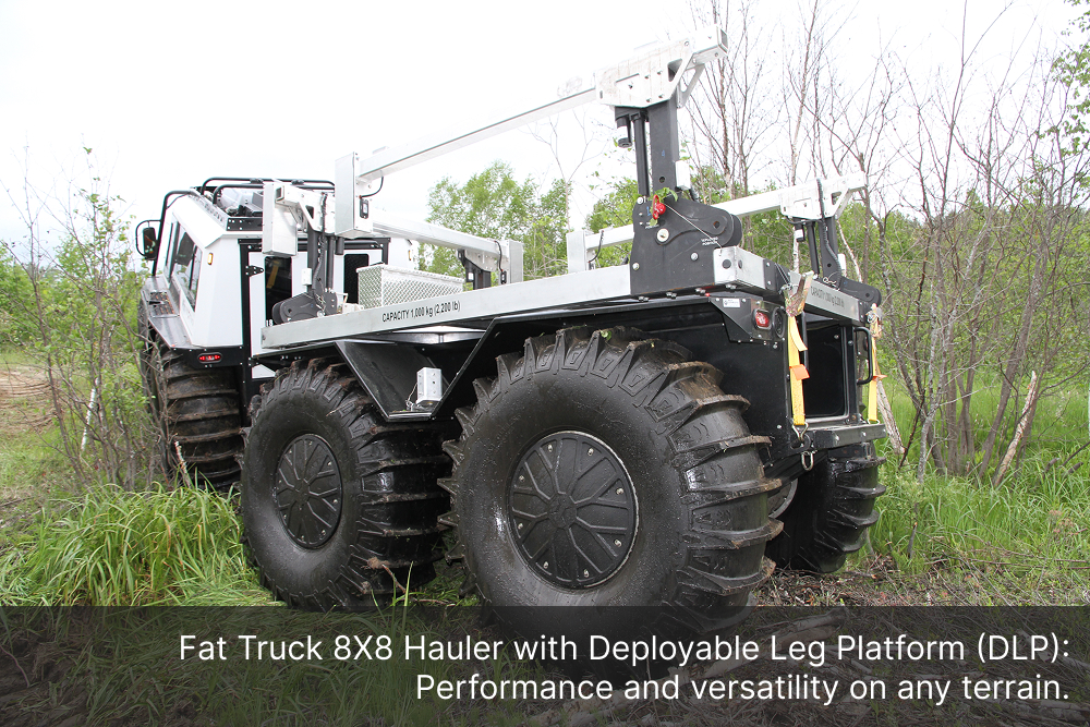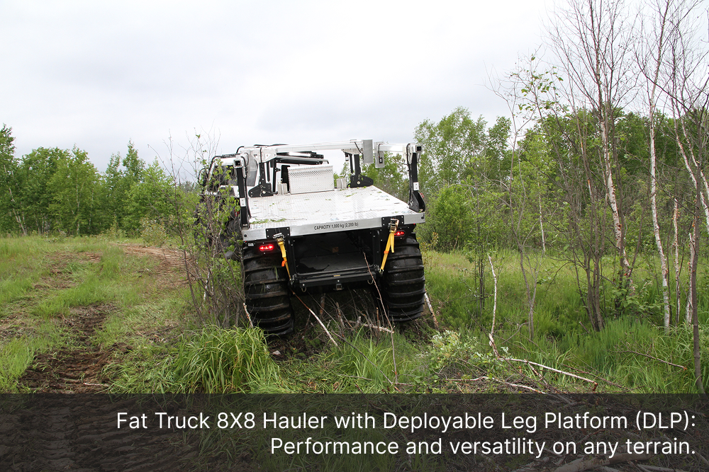 The Demountable Leg Platform is engineered with a quick and secure lift-and-lower system, allowing operators to install or remove the unit with minimal effort, saving valuable time in the field. Its adjustable ground-support bases ensure safe loading and unloading operations, even on uneven terrain, while minimizing downtime, maximizing productivity, and freeing up the Fat Truck 8X8H to be used in additional operations.